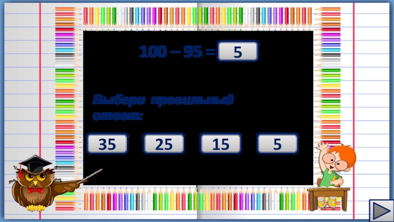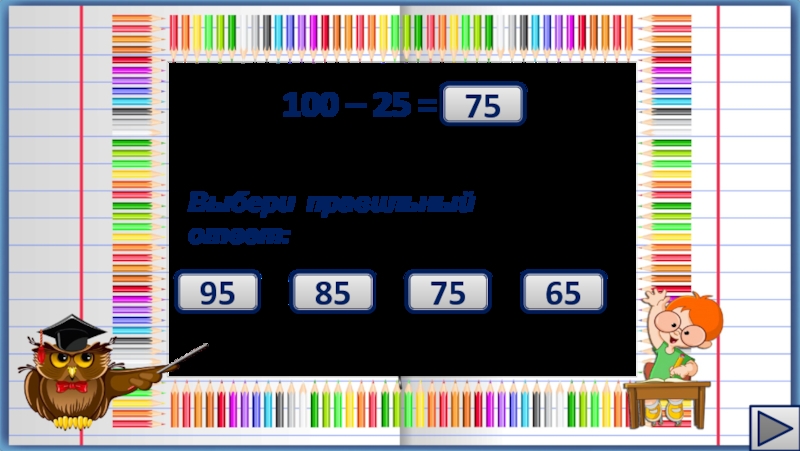 100 – 25 = ? Выбери правильный ответ:7575658595