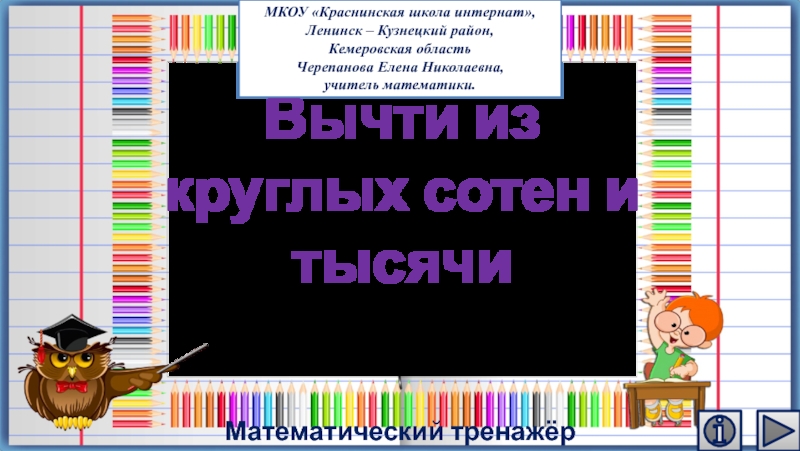 Вычти из круглых сотен и тысячиМатематический тренажёрМКОУ «Краснинская школа интернат»,Ленинск – Кузнецкий район,Кемеровская областьЧерепанова Елена Николаевна,учитель математики.