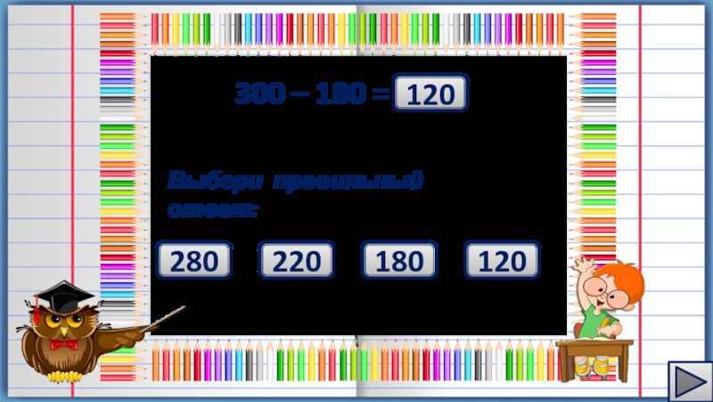 300 – 180 = ? Выбери правильный ответ:120120180220280
