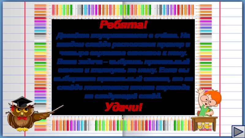 Ребята!Давайте поупражняемся в счёте. На каждом слайде расположен пример и четыре варианта ответов к нему. Ваша задача – выбрать правильный ответ и кликнуть по нему. Если вы выбираете правильный ответ, то на слайде появляется кнопка перехода
