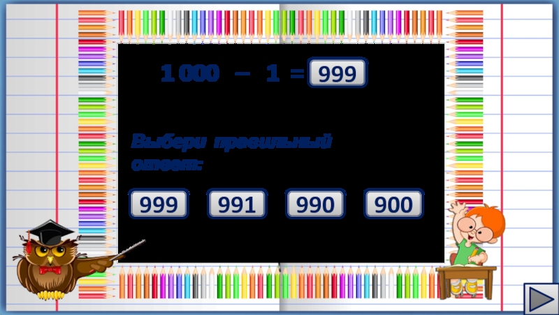 1 000  –  1 = ? Выбери правильный ответ:999999990991900