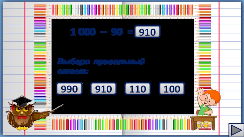 1 000 – 90 = ? Выбери правильный ответ:910910110990100