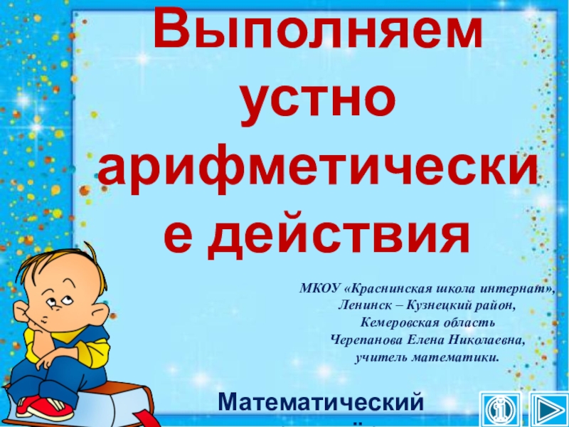 Выполняем устно арифметические действияМатематический тренажёрМКОУ «Краснинская школа интернат»,Ленинск – Кузнецкий район,Кемеровская областьЧерепанова Елена Николаевна,учитель математики.