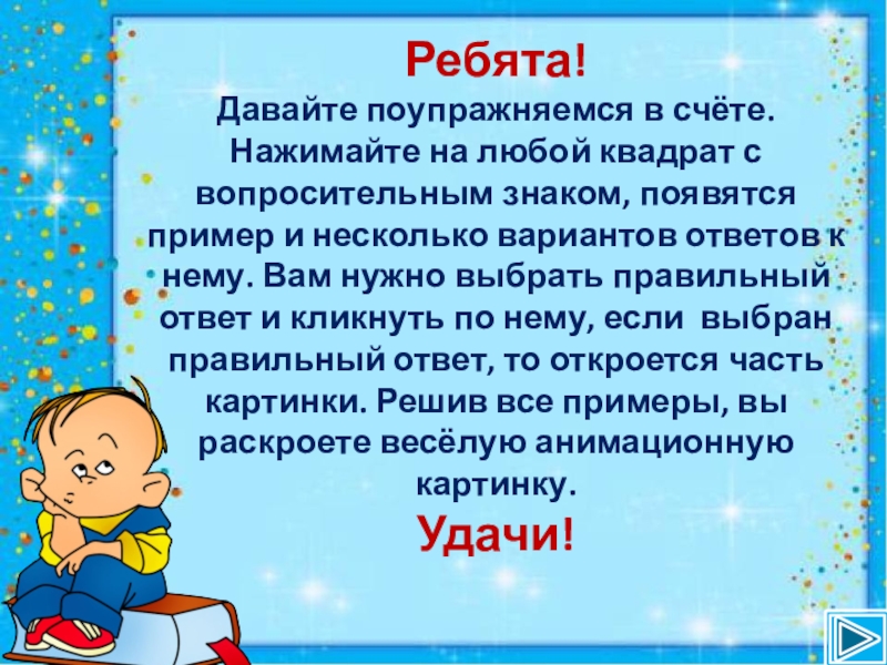 Давайте поупражняемся в счёте. Нажимайте на любой квадрат с вопросительным знаком,