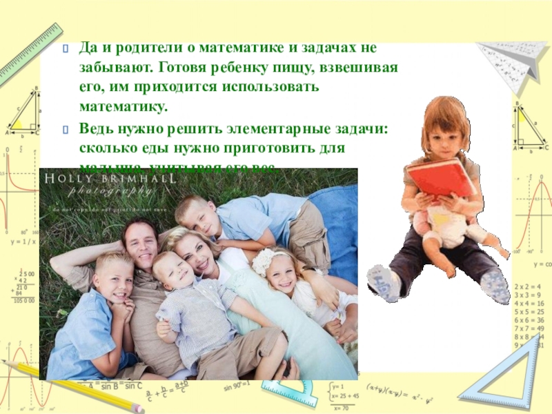 Слайд 8Да и родители о математике и задачах не забывают. Готовя ребенку