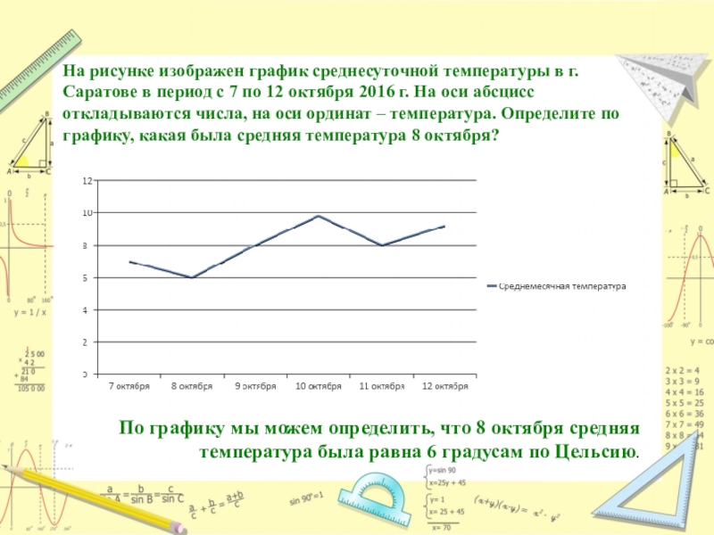 с 7 по 12 октября 2016 г. На оси абсцисс откладываются числа, на оси ординат – температура. Определите по графику, какая была средняя температура 8 октября?