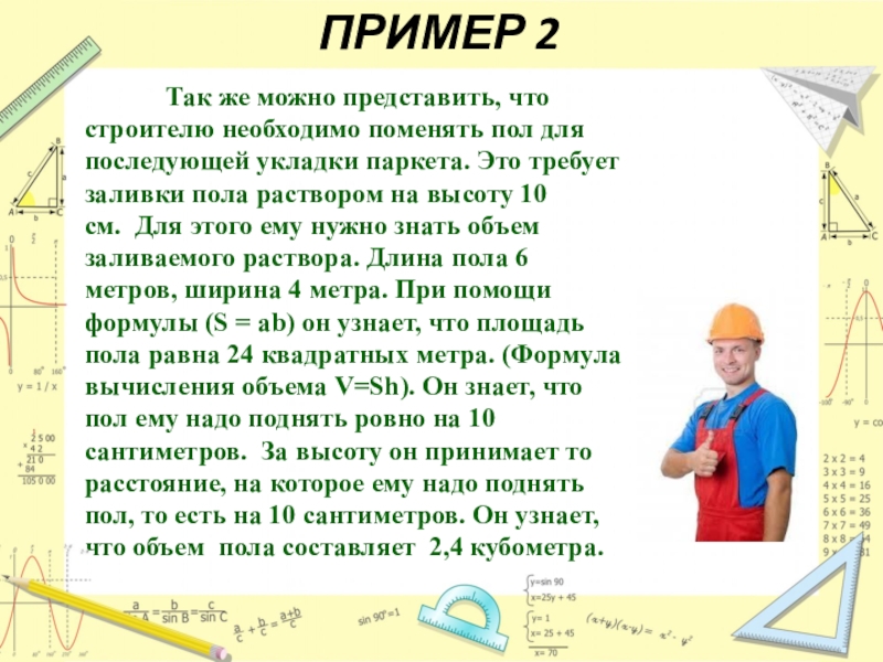 строителю необходимо поменять пол для последующей укладки паркета. Это требует заливки пола раствором на высоту 10 см. Для этого ему нужно знать объем заливаемого раствора. Длина пола 6 метров, ширина 4 метра. При помощи формулы (S = ab) он узнает, что площадь пола равна 24 квадратных метра. (Формула вычисления объема V=Sh). Он знает, что пол ему надо поднять ровно на 10 сантиметров. За высоту он принимает то расстояние, на которое ему надо поднять пол, то есть на 10 сантиметров. Он узнает, что объем пола составляет 2,4 кубометра.