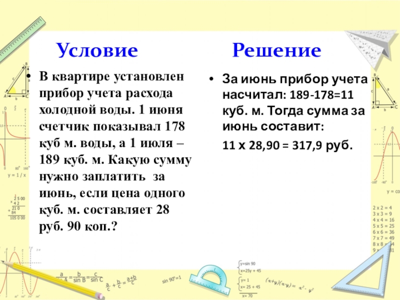 расхода холодной воды. 1 июня счетчик показывал 178 куб м. воды, а 1 июля – 189 куб. м. Какую сумму нужно заплатить за июнь, если цена одного куб. м. составляет 28 руб. 90 коп.?