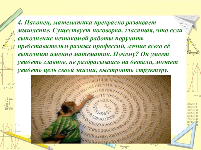 Слайд 134. Наконец, математика прекрасно развивает мышление. Существует поговорка, гласящая, что если