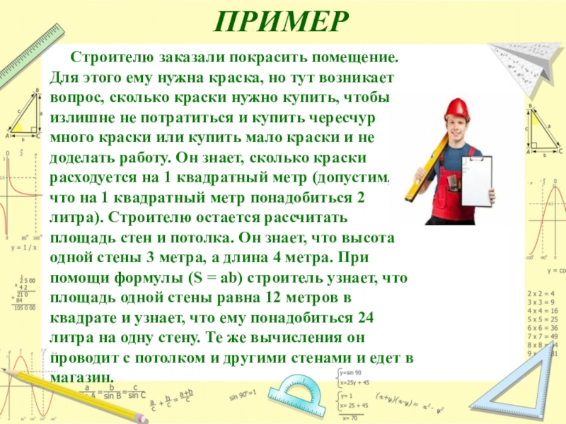 краска, но тут возникает вопрос, сколько краски нужно купить, чтобы излишне не потратиться и купить чересчур много краски или купить мало краски и не доделать работу. Он знает, сколько краски расходуется на 1 квадратный метр (допустим, что на 1 квадратный метр понадобиться 2 литра). Строителю остается рассчитать площадь стен и потолка. Он знает, что высота одной стены 3 метра, а длина 4 метра. При помощи формулы (S = ab) строитель узнает, что площадь одной стены равна 12 метров в квадрате и узнает, что ему понадобиться 24 литра на одну стену. Те же вычисления он проводит с потолком и другими стенами и едет в магазин.