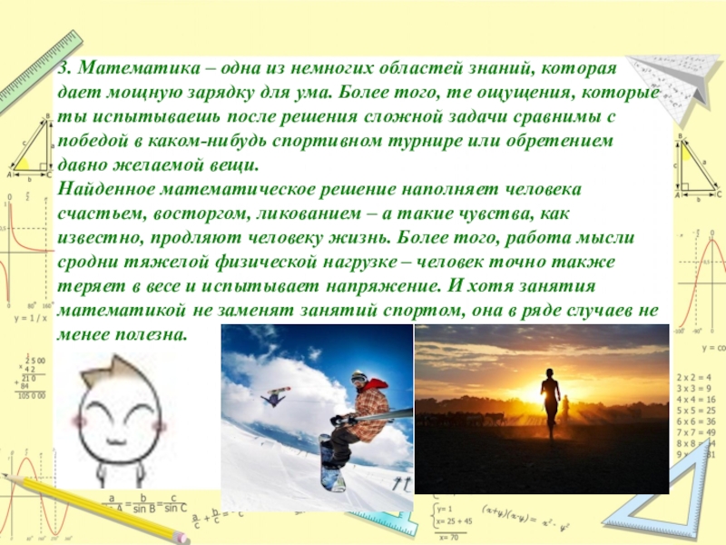 Найденное математическое решение наполняет человека счастьем, восторгом, ликованием – а такие чувства, как известно, продляют человеку жизнь. Более того, работа мысли сродни тяжелой физической нагрузке – человек точно также теряет в весе и испытывает напряжение. И хотя занятия математикой не заменят занятий спортом, она в ряде случаев не менее полезна.
