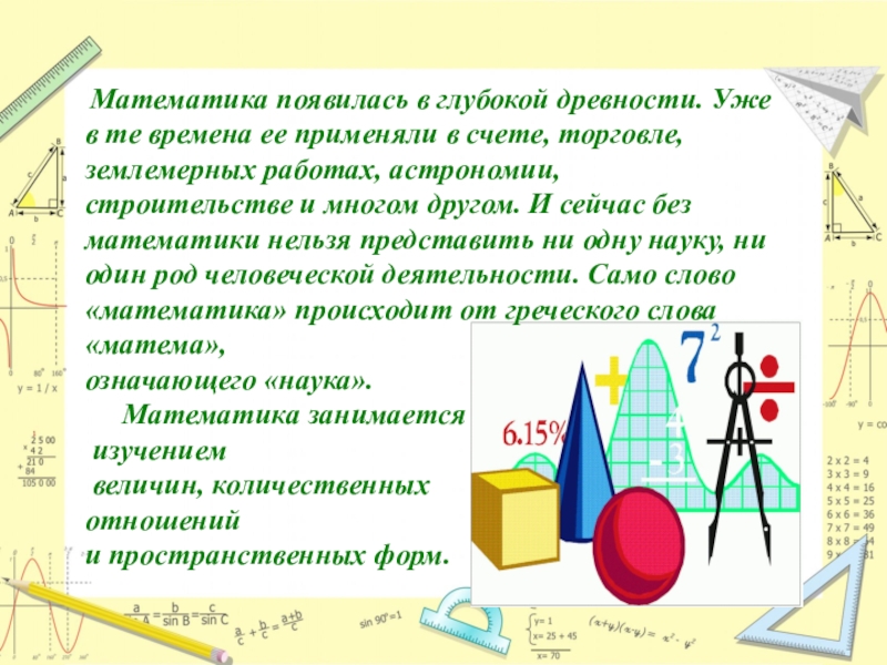 применяли в счете, торговле, землемерных работах, астрономии, строительстве и многом другом. И сейчас без математики нельзя представить ни одну науку, ни один род человеческой деятельности. Само слово «математика» происходит от греческого слова «матема»,