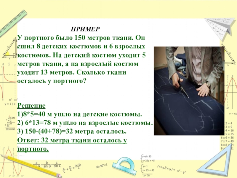 У портного было 150 метров ткани. Он сшил 8 детских костюмов