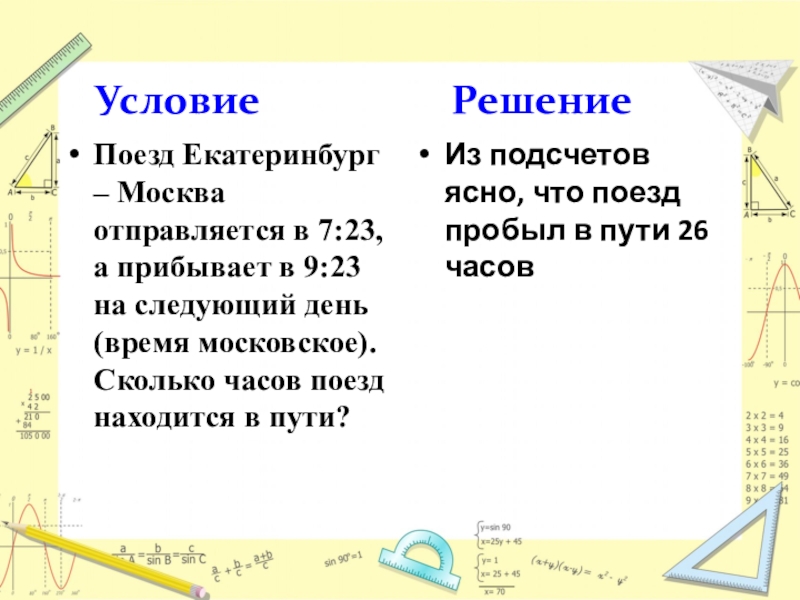 на следующий день (время московское). Сколько часов поезд находится в пути?