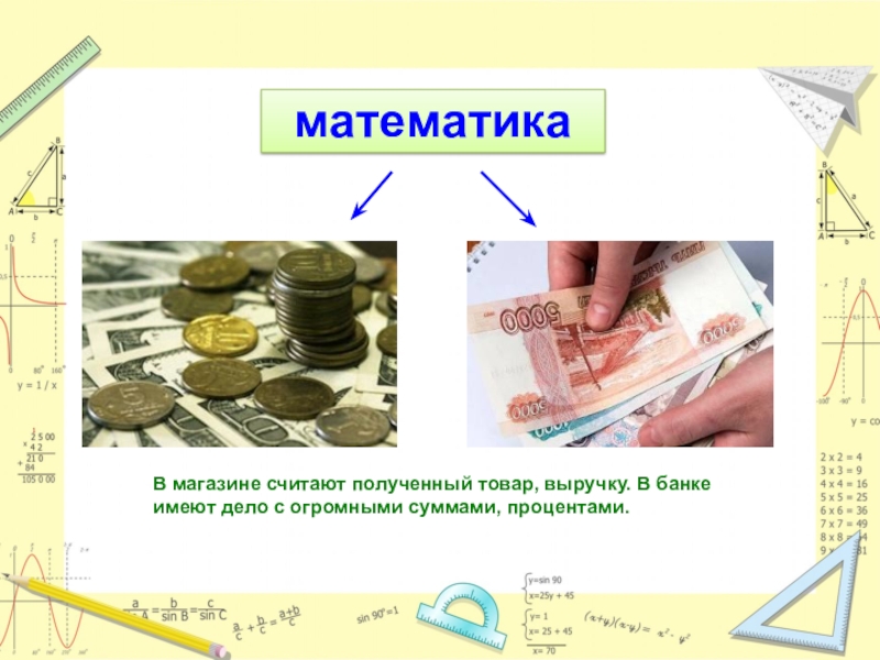 В магазине считают полученный товар, выручку. В банке имеют дело с