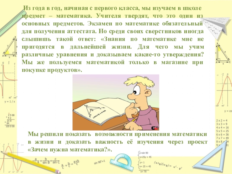 Мы решили показать возможности применения математики в жизни и доказать важность её изучения через проект «Зачем нужна математика?».