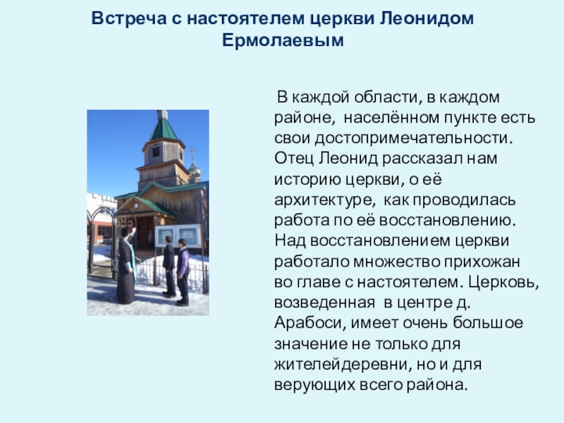 каждом районе, населённом пункте есть свои достопримечательности. Отец Леонид рассказал нам историю церкви, о её архитектуре, как проводилась работа по её восстановлению. Над восстановлением церкви работало множество прихожан во главе с настоятелем. Церковь, возведенная в центре д. Арабоси, имеет очень большое значение не только для жителейдеревни, но и для верующих всего района.