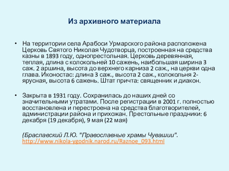(Браславский Л.Ю. "Православные храмы Чувашии". http://www.nikola-ygodnik.narod.ru/Raznoe_093.html