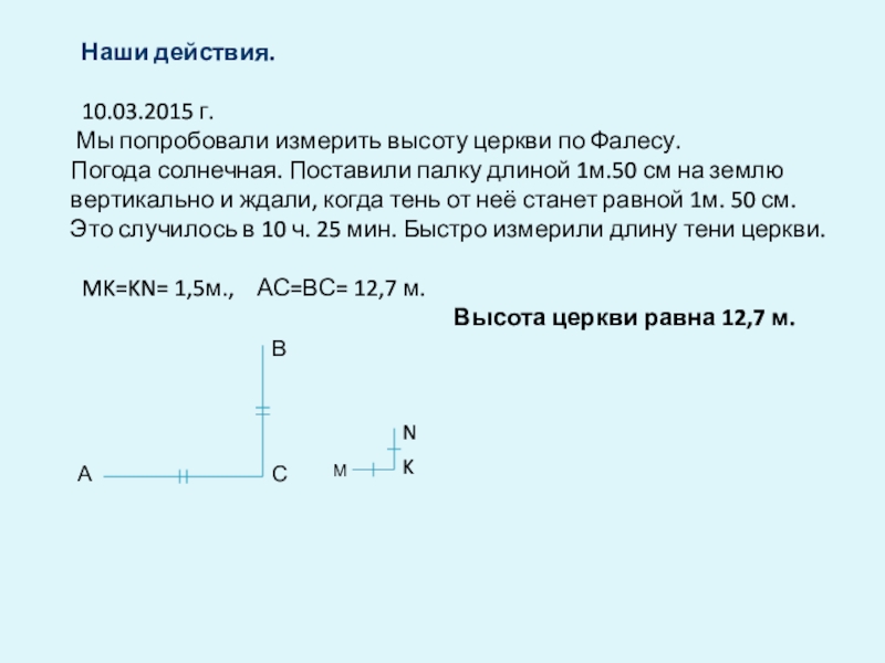 Погода солнечная. Поставили палку длиной 1м.50 см на землю вертикально и ждали, когда тень от неё станет равной 1м. 50 см. Это случилось в 10 ч. 25 мин. Быстро измерили длину тени церкви.
