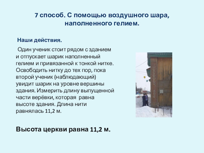 Один ученик стоит рядом с зданием и отпускает шарик наполненный гелием и привязанной к тонкой нитке. Освободить нитку до тех пор, пока второй ученик (наблюдающий) увидит шарик на уровне вершины здания. Измерить длину выпущенной части верёвки, которая равна высоте здания. Длина нити равнялась 11,2 м.