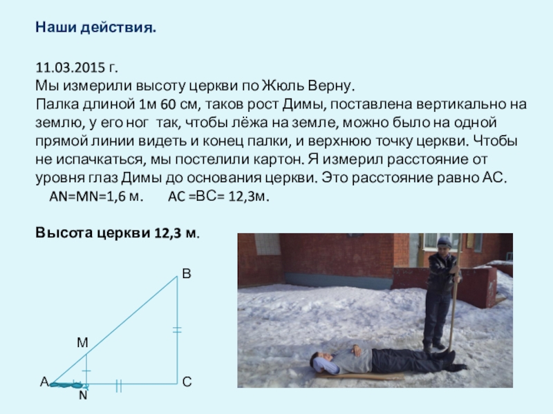 1м 60 см, таков рост Димы, поставлена вертикально на землю, у его ног так, чтобы лёжа на земле, можно было на одной прямой линии видеть и конец палки, и верхнюю точку церкви. Чтобы не испачкаться, мы постелили картон. Я измерил расстояние от уровня глаз Димы до основания церкви. Это расстояние равно АС.