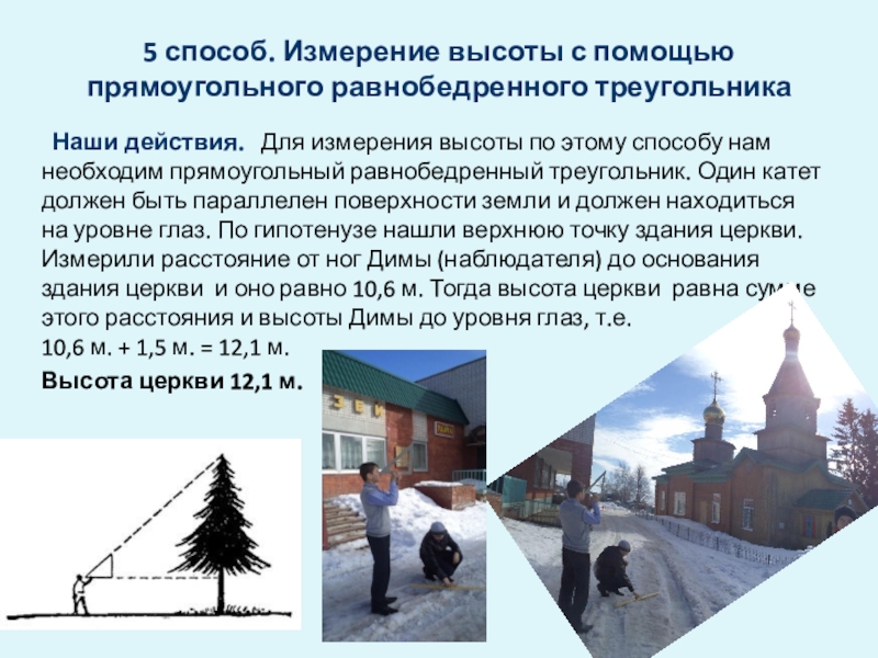 Наши действия. Для измерения высоты по этому способу нам необходим прямоугольный равнобедренный треугольник. Один катет должен быть параллелен поверхности земли и должен находиться на уровне глаз. По гипотенузе нашли верхнюю точку здания церкви. Измерили расстояние от ног Димы (наблюдателя) до основания здания церкви и оно равно 10,6 м. Тогда высота церкви равна сумме этого расстояния и высоты Димы до уровня глаз, т.е. 10,6 м. + 1,5 м. = 12,1 м.