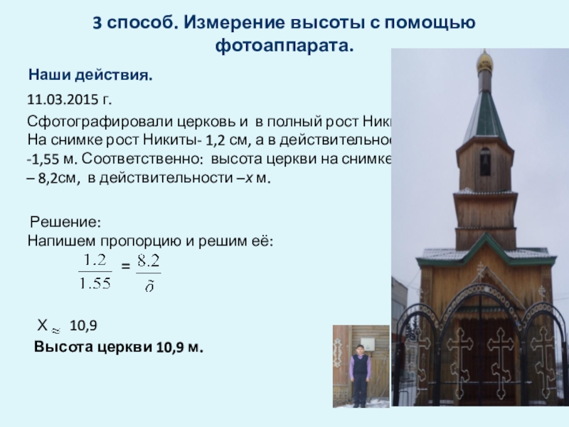 Сфотографировали церковь и в полный рост Никиту. На снимке рост Никиты- 1,2 см, а в действительности -1,55 м. Соответственно: высота церкви на снимке – 8,2см, в действительности –х м.