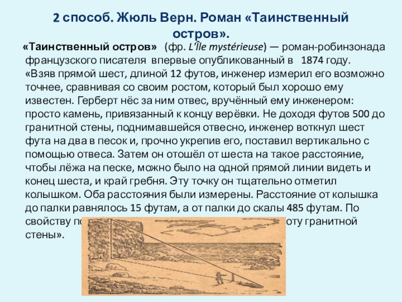 остров» (фр. L'Île mystérieuse) — роман-робинзонада французского писателя впервые опубликованный в 1874 году. «Взяв прямой шест, длиной 12 футов, инженер измерил его возможно точнее, сравнивая со своим ростом, который был хорошо ему известен. Герберт нёс за ним отвес, вручённый ему инженером: просто камень, привязанный к концу верёвки. Не доходя футов 500 до гранитной стены, поднимавшейся отвесно, инженер воткнул шест фута на два в песок и, прочно укрепив его, поставил вертикально с помощью отвеса. Затем он отошёл от шеста на такое расстояние, чтобы лёжа на песке, можно было на одной прямой линии видеть и конец шеста, и край гребня. Эту точку он тщательно отметил колышком. Оба расстояния были измерены. Расстояние от колышка до палки равнялось 15 футам, а от палки до скалы 485 футам. По свойству подобных треугольников вычислили высоту гранитной стены».
