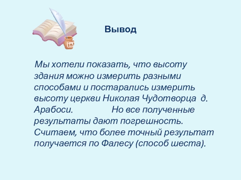 способами и постарались измерить высоту церкви Николая Чудотворца д. Арабоси. Но все полученные результаты дают погрешность. Считаем, что более точный результат получается по Фалесу (способ шеста).