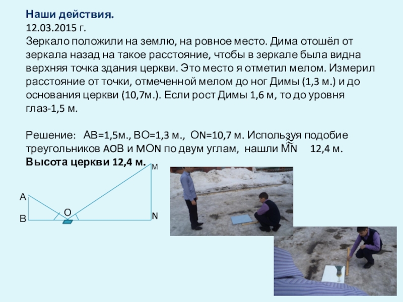 от зеркала назад на такое расстояние, чтобы в зеркале была видна верхняя точка здания церкви. Это место я отметил мелом. Измерил расстояние от точки, отмеченной мелом до ног Димы (1,3 м.) и до основания церкви (10,7м.). Если рост Димы 1,6 м, то до уровня глаз-1,5 м.