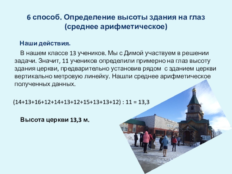 В нашем классе 13 учеников. Мы с Димой участвуем в решении задачи. Значит, 11 учеников определили примерно на глаз высоту здания церкви, предварительно установив рядом с зданием церкви вертикально метровую линейку. Нашли среднее арифметическое полученных данных.