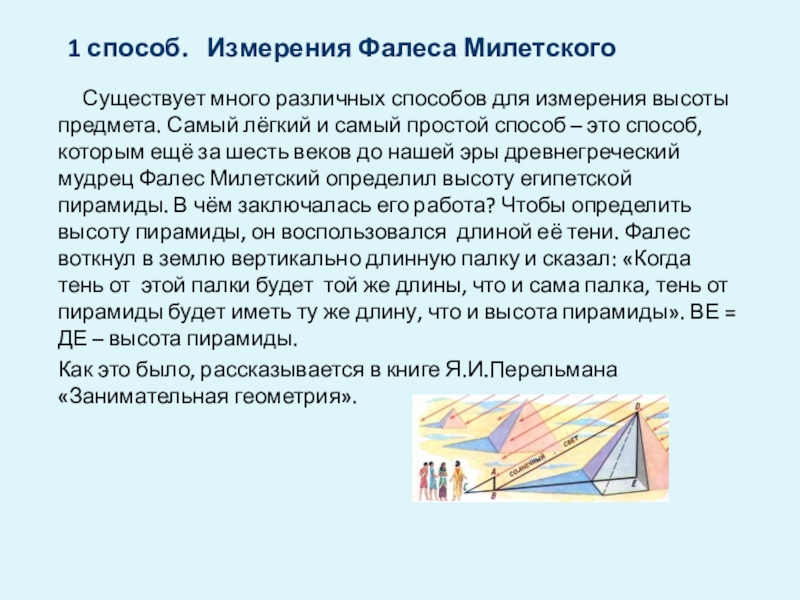 способов для измерения высоты предмета. Самый лёгкий и самый простой способ – это способ, которым ещё за шесть веков до нашей эры древнегреческий мудрец Фалес Милетский определил высоту египетской пирамиды. В чём заключалась его работа? Чтобы определить высоту пирамиды, он воспользовался длиной её тени. Фалес воткнул в землю вертикально длинную палку и сказал: «Когда тень от этой палки будет той же длины, что и сама палка, тень от пирамиды будет иметь ту же длину, что и высота пирамиды». ВЕ = ДЕ – высота пирамиды.