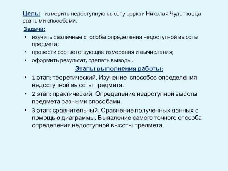 Слайд 3Цель: измерить недоступную высоту церкви Николая Чудотворца разными способами.