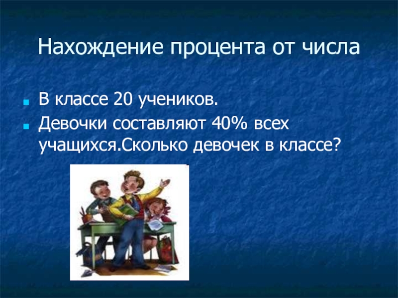 Нахождение процента от числа В классе 20 учеников.Девочки составляют 40% всех учащихся.Сколько девочек в классе?