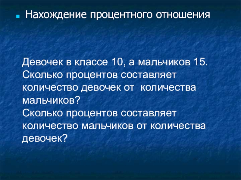 Нахождение процентного отношенияДевочек в классе 10, а мальчиков 15.Сколько процентов составляет количество девочек от количества мальчиков?Сколько процентов