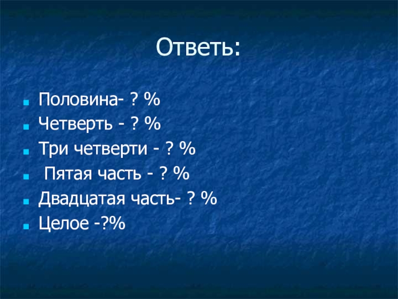Ответь:Половина- ? %Четверть - ? %Три четверти - ? % Пятая часть - ? %Двадцатая часть- ?