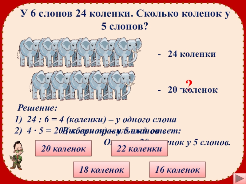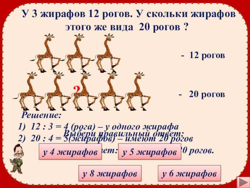 20 : 4 = 5(жирафов) – имеют 20 рогов