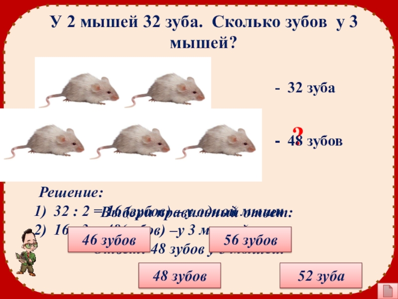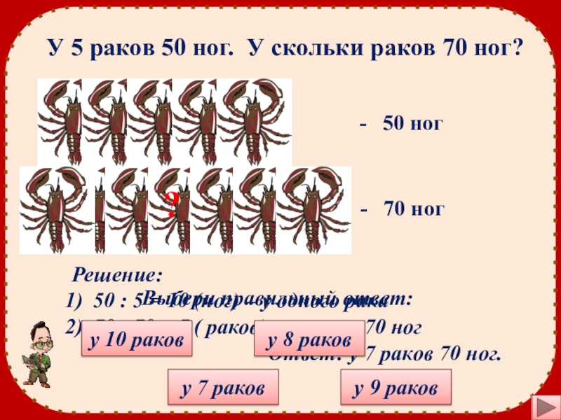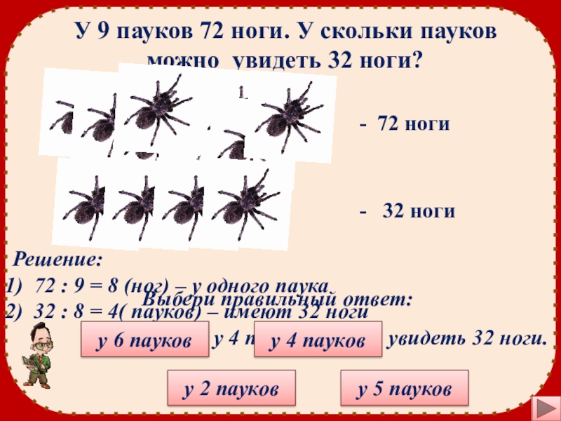 32 : 8 = 4( пауков) – имеют 32 ноги