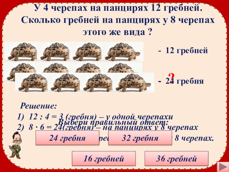 8 ∙ 6 = 24(гребня) – на панцирях у 8 черепах