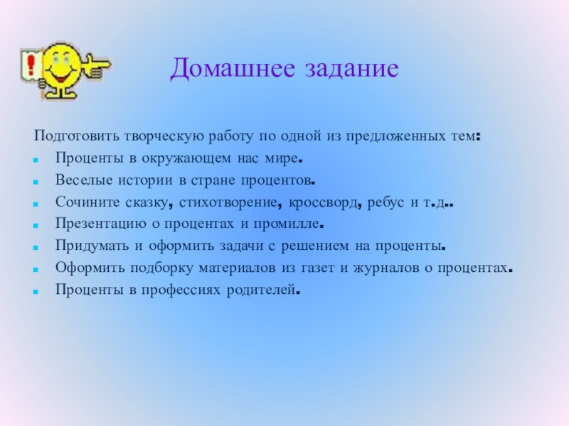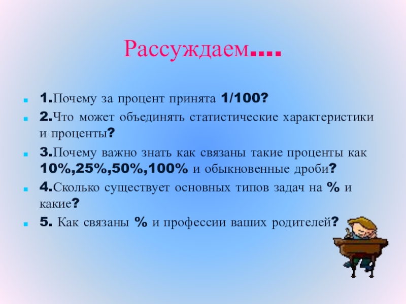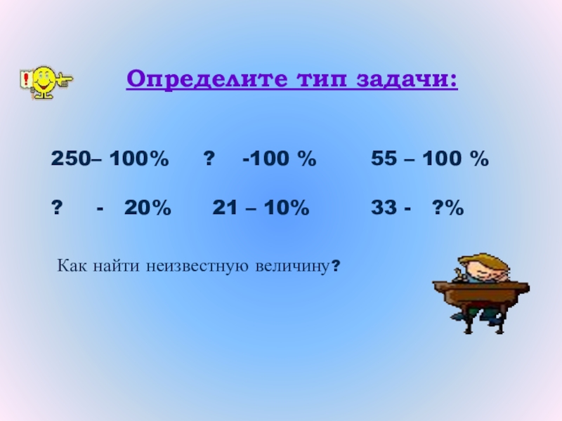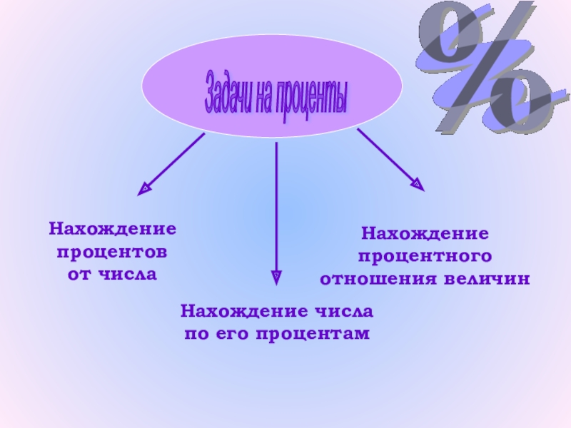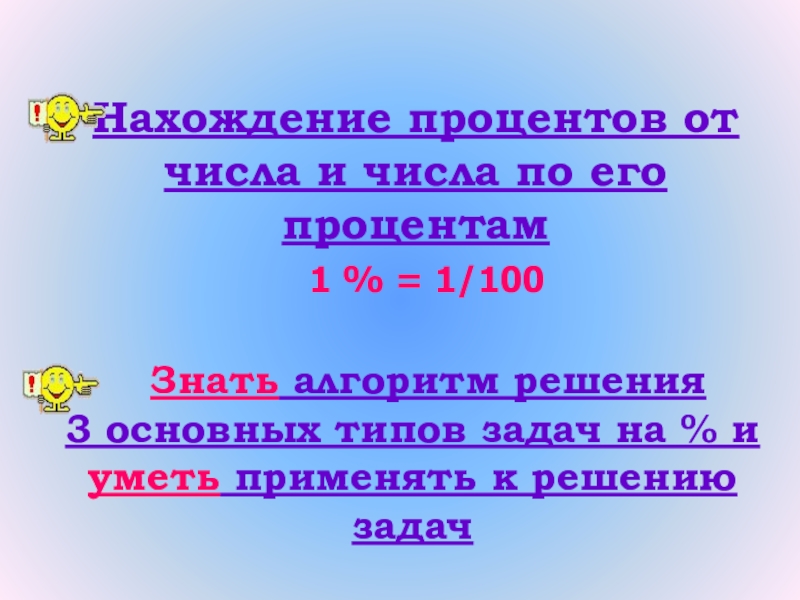 Знать алгоритм решения 3 основных типов задач на % и уметь применять к решению задач
