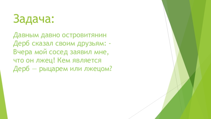 Задача:Давным давно островитянин Дерб сказал своим друзьям: - Вчера мой сосед заявил мне, что он лжец! Кем