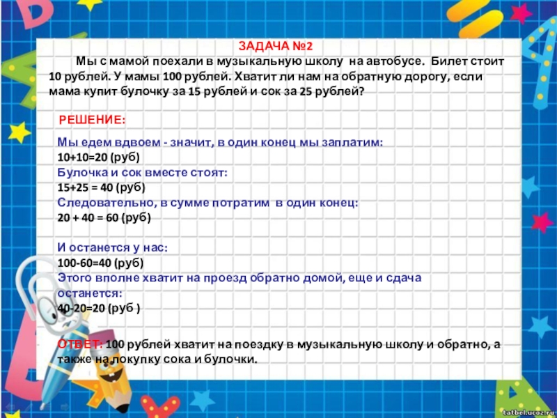 ОТВЕТ: 100 рублей хватит на поездку в музыкальную школу и обратно, а также на покупку сока и булочки.