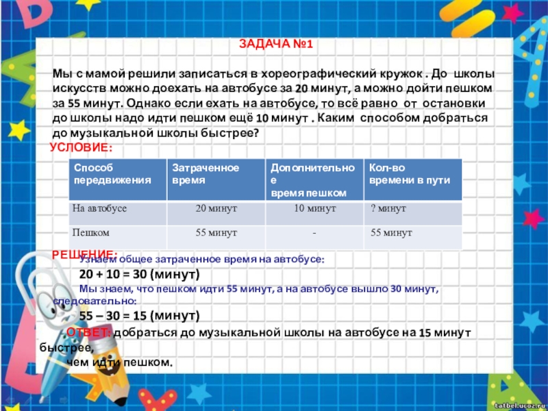 ОТВЕТ: добраться до музыкальной школы на автобусе на 15 минут быстрее,