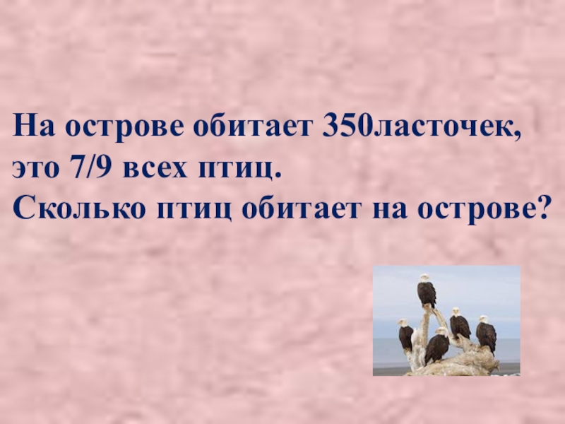 На острове обитает 350ласточек,это 7/9 всех птиц.Сколько птиц обитает на острове?