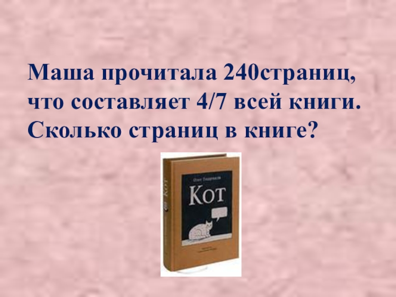 Маша прочитала 240страниц, что составляет 4/7 всей книги.Сколько страниц в книге?