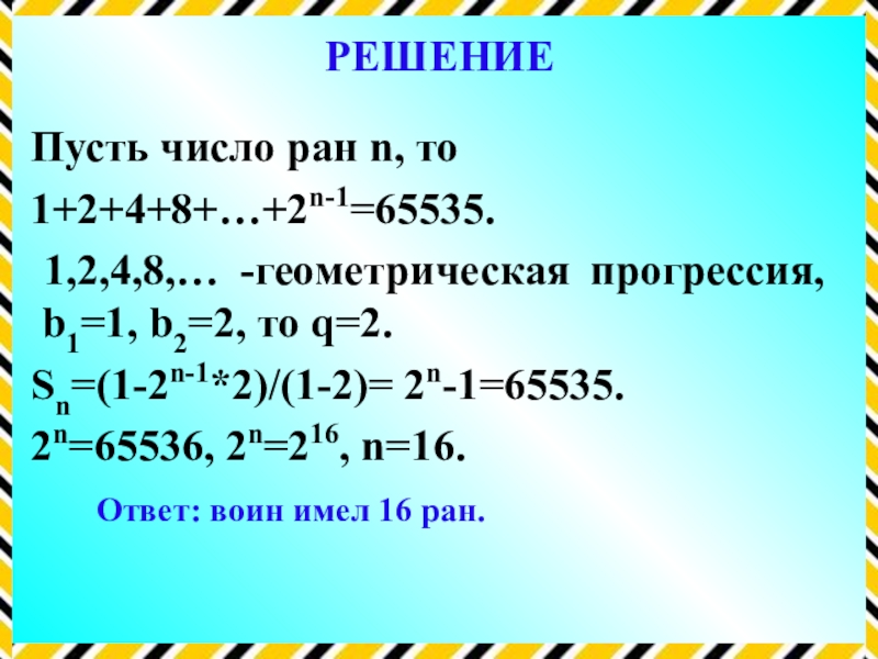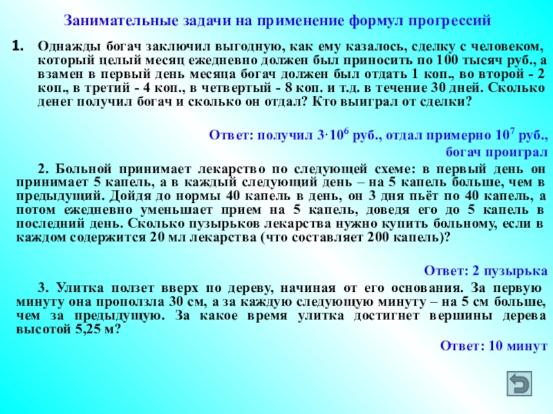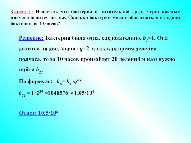 Решение: Бактерия была одна, следовательно, b1=1. Она делится на две, значит q=2, а так как время деления полчаса, то за 10 часов произойдет 20 делений и нам нужно найти b21