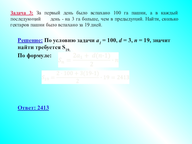 Решение: По условию задачи а1 = 100, d = 3, n = 19, значит найти требуется S19.