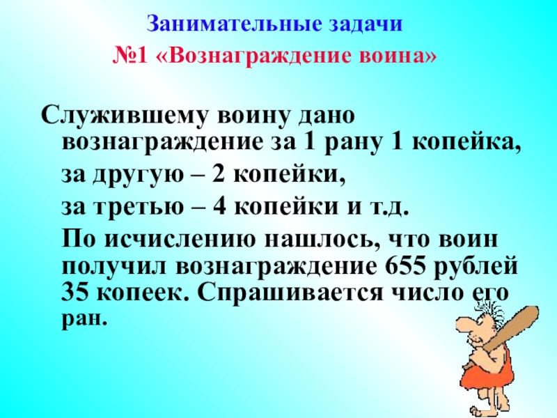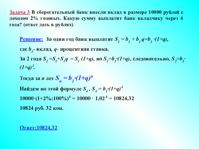 Решение: За один год банк выплатит S1 = b1 + b1 q=b1 ·(1+q),