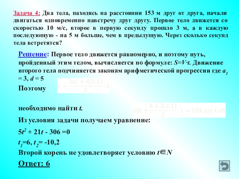 Решение: Первое тело движется равномерно, и поэтому путь, пройденный этим телом, вычисляется по формуле: S=V·t. Движение второго тела подчиняется законам арифметической прогрессии где а1 = 3, d = 5