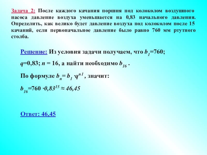 Решение: Из условия задачи получаем, что b1=760; q=0,83; n = 16, а найти необходимо b16 .
